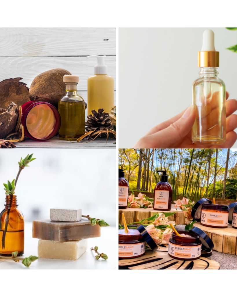 Fórmulas exclusivas de cosmética natural, como hidratantes capilares, aceites corporales, exfoliantes y mucho más.